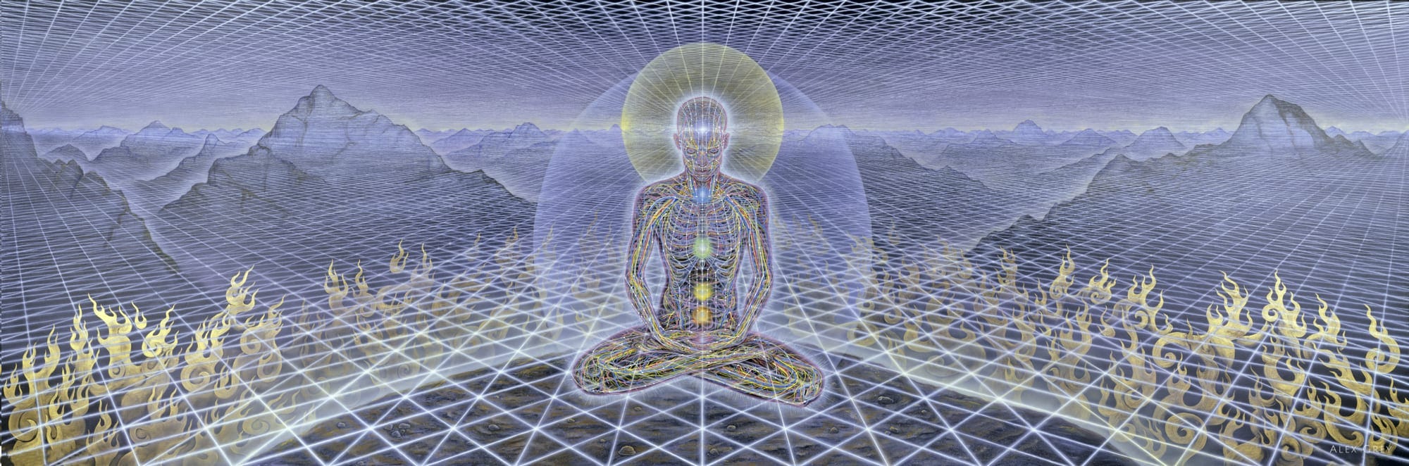 A human figure kneels, translucent, dissolving into the radiance that surrounds and permeates it. Here, form and spirit are no longer separate the nervous system becomes a map of light, the flesh a doorway to infinity.